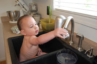Who wouldn't want a personal sized bath tub that is deep and cool? With warm water and a personal spray nozzle. Sounds good to me! Luckily Nater loved it too! Best bath time ever for him was when I bathed him in the kitchen sink the other day. He had covered himself in smoothie, and I was too pregnant to try to lean over a tub to clean him off. Into the sink he went. He was beyond thrilled and thought it was the greatest day ever!!!! He liked to turn the water on and off and didn't mind being bathed with the sprayer. I love how much he loves the little things in life!